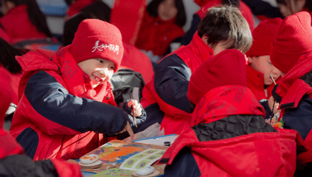 孩子们戴上实践队精心准备的针织冬帽,并围上温暖的围巾