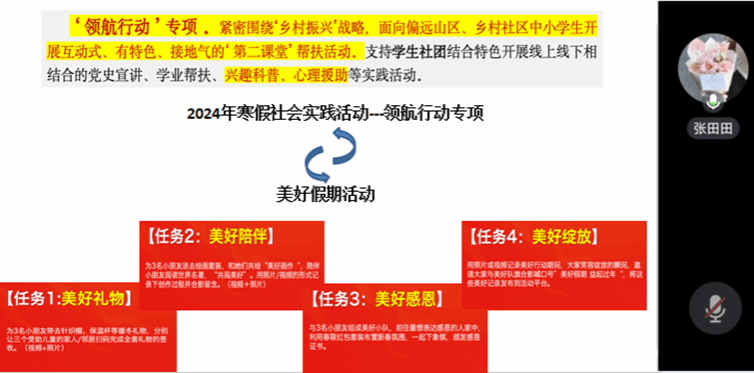 2024年1月18日晚,pp电子游戏平台网站团委线上举办了2024年寒假社会实践动员大会暨经验分享会。会上重点针对本次“美好假期”公益活动,结合2024年寒假社会实践相关通知要求,鼓励同学们将其与寒假社会实践“青担新使命”——“领航行动”专项深度融合,围绕“乡村振兴”战略,面向乡村社区中小学生开展互动式、有特色、接地气的“第二课堂”帮扶活动。