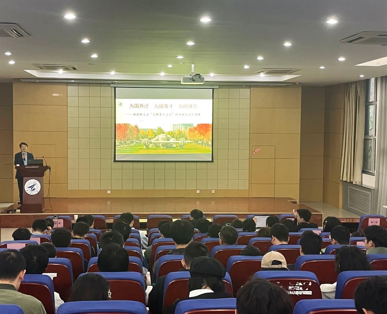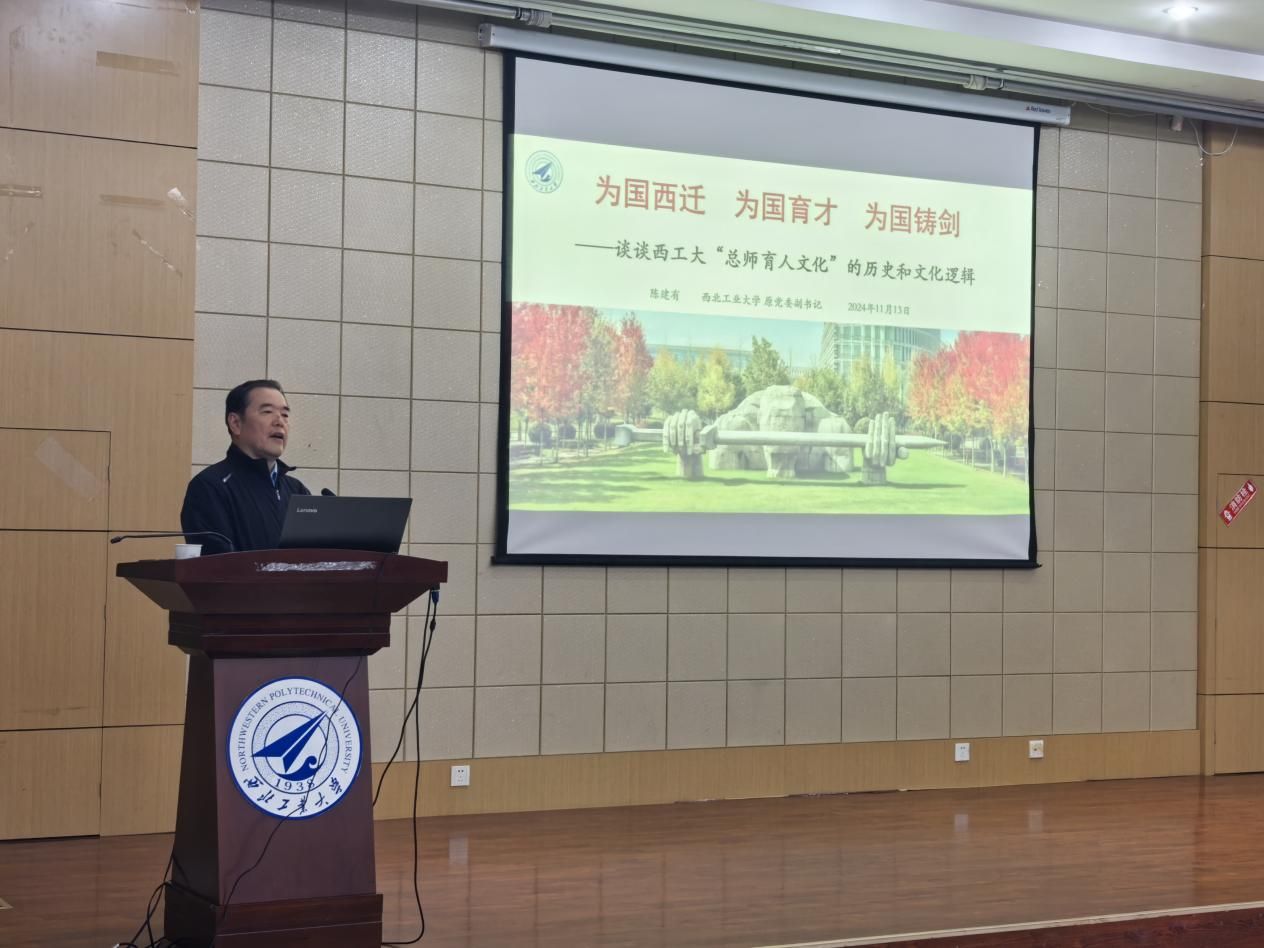 陈建有围绕“为国西迁、为国育才、为国铸剑”三个关键词,结合电影、话剧、音乐剧等多种形式,生动解读了pp电子游戏平台网站“总师育人文化”的丰富内涵和历史渊源。他回顾了西工大的西迁历程,展现了学校在国家重大战略需求中的重要作用及西工大人的家国情怀和奉献精神。通过列举杰出校友和“总师”人物,展示了西工大在航空航天航海等领域的重要贡献,并深入阐述了学校“为国育才”的教育理念。他强调,西工大始终以培养具有家国情怀、创新精神和实践能力的高素质人才为根本任务。在“为国铸剑”部分,陈建有结合西工大在国防科技领域的成就,讲述了学校科研创新与国家战略的紧密结合,在为国家科技实力和国防力量做出的贡献。他鼓励师生继承和发扬西工大的优良传统,为实现中华民族伟大复兴的中国梦贡献力量。