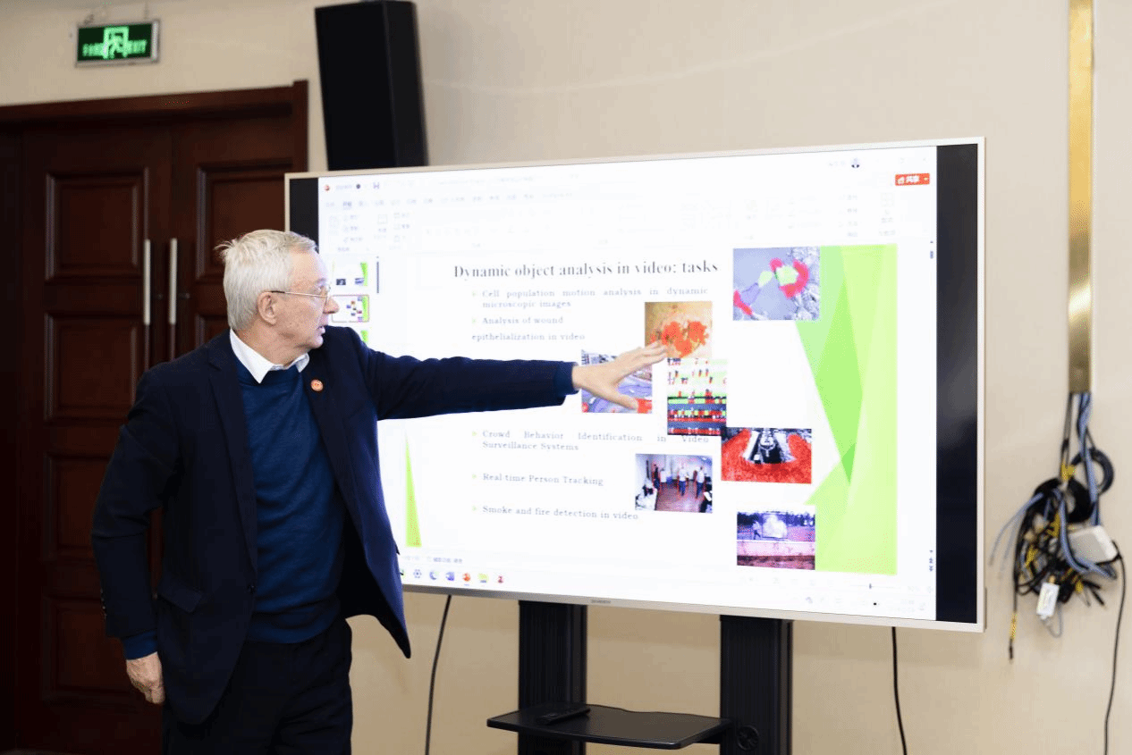 Shang Xuequn, on behalf of the SCS, welcomed the arrival of scholars from the Belarusian State University and introduced the development, discipline construction, and cooperation intentions of the school. Subsequently, Professor Sergei Vladimirovich Abrameiko and Professor Mikhail Rulavkov respectively presented exciting reports titled "Dynamic Objects Motion Analysis in Video Using Optical Flow and Neural Networks" and "Science and Educational Activity of Mechanics and Mathematics in Belarusian State University". The scholars provided information on the relevant work of the team's research and development on mobile target motion analysis based on overall optical flow and neural network models, as well as the basic situation and disciplinary direction of the college. The faculty and students attending the ceremony listened to the lecture and had useful exchanges with foreign experts. During the Q&A and discussion session, two Belarusian professors gave detailed answers to multiple questions from the teachers and students, as well as offered specific guidance and suggestions. The attending teachers and students benefited greatly from the intense but lively discussions.