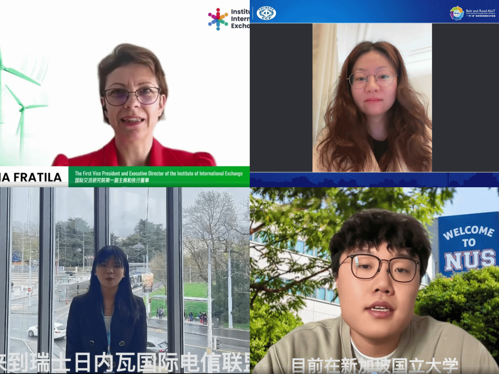 Lavinia Fratila、余嘉丹、景瑶、李奇以线上或视频的形式出席了会议,表达了对全球IT胜任力发展中心正式成立的祝贺。并根据各自工作或实习经历和与会同学进行了经验分享,鼓励大家成为国际交流的使者,提升跨学科学习能力和跨文化交流能力,成为兼具国际胜任力和国际视野的IT领军人才,为中华民族乃至世界的发展作出自己的贡献。